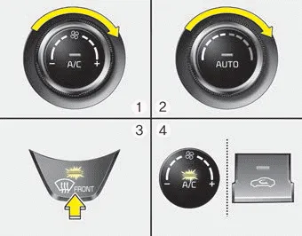 To defog inside windshield 1. Select any fan speed except "0" position. 2. Select desired temperature. 3. Select the or position. 4. The outside (fresh) air will be selected automatically.