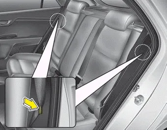 1. When folding the seat back, insert the rear seat belt buckle in the pocket between the rear seatback and cushion then make sure both seatbelts do not interfere with stowed luggage and cargo. Then, insert the seat belt into the two holes located on both sides.