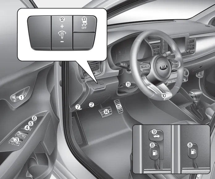 1. Instrument cluster 2. Horn 3. Driver’s front air bag 4. Light control/Turn signals 5. Wiper/Washer 6. Ignition switch ENGINE START/STOP button 7.