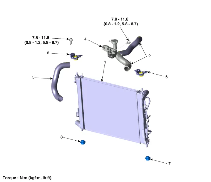 [LH] 6. Radiator upper mounting bracket [RH] 7. Radiator lower mounting insulator [LH] 8. Radiator lower mounting insulator [RH] |