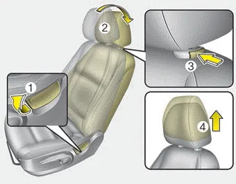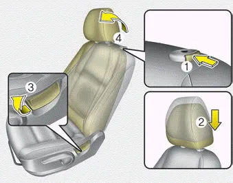 3. Press the headrest release button (3) while pulling the headrest up (4).