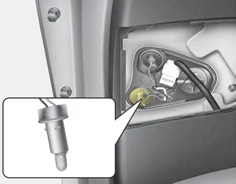 1. Open the liftgate. 2. Remove the service cover. 3. Remove the socket from the assembly by turning the socket counterclockwise until the tabs on the socket align with the slots on the assembly.