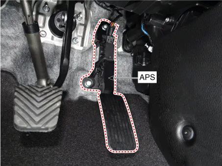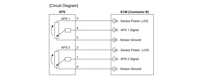 Accelerator Position Sensor (APS) is installed on the accelerator pedal module and detects the rotation angle of the accelerator pedal. The APS is one of the most important sensors in engine control system, so it consists of the two sensors which adapt individual sensor power and ground line. The second sensor monitors the first sensor and its output voltage is half of the first one. If the ratio of the sensor 1 and 2 is out of the range (approximately 1/2), the diagnostic system judges that it is abnormal.