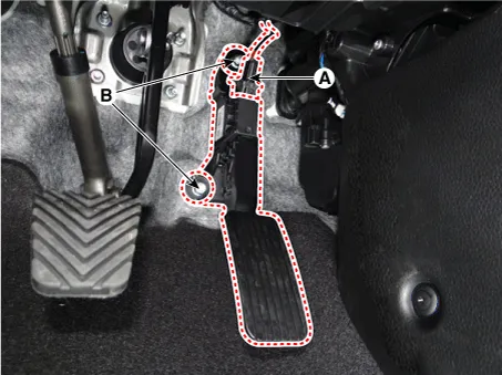 Remove the installation nuts (B) and then remove the accelerator pedal module.
