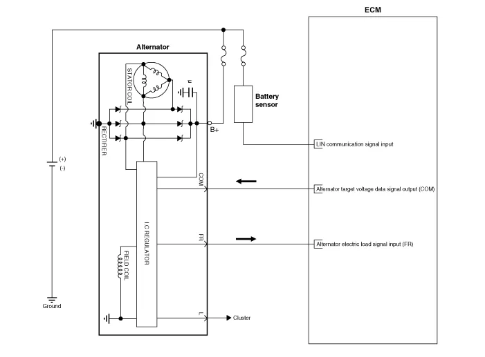 Components and components location Components ① ECM ② Battery ③ Alternator ④ Starter ⑤ Instrument Cluster ⑥ Ignition switch or start/stop button ⑦ Battery sensor ⑧ Hood switch Description and operation Description The charging system included a battery, an alternator with a built-in regulator, and the charging indicator light and wire.