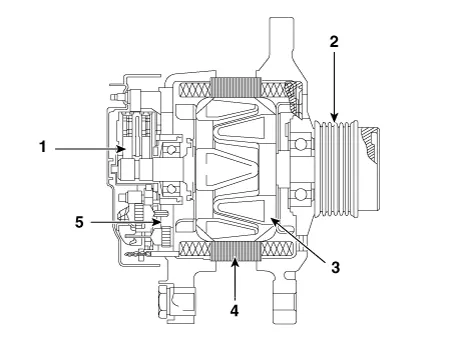 | 1. Brush 2. Over-running Alternator (OAP) Pulley 3. Rotor 4. Stator 5. Rectifier |