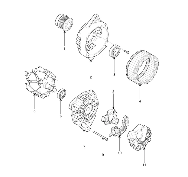 Bracket 8. Brush Holder Assembly 9. Through Bolt 10. Rectifier Assembly 11. Rear Cover |