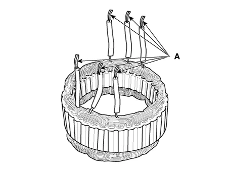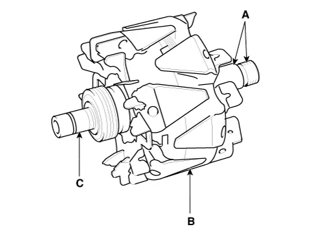 Check that there is no continuity between the slip rings and the rotor (B) or rotor shaft (C).