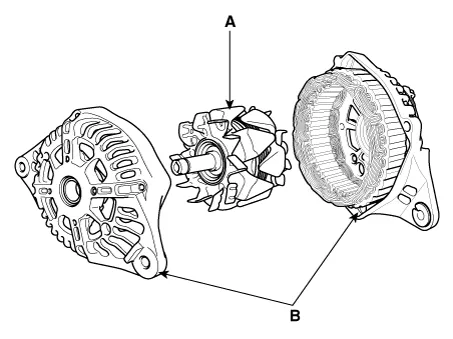 The main components of the alternator are the rotor, stator, rectifier, capacitor brushes, bearings and V-ribbed belt pulley.