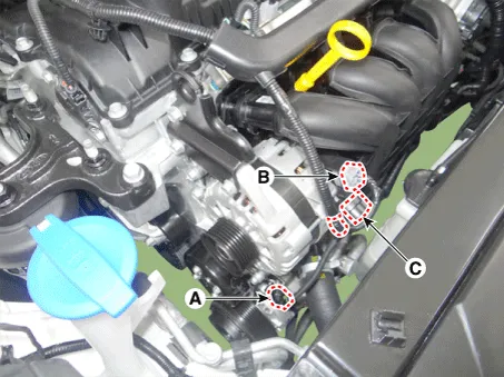 Disconnect the air compressor connector (A) and the alternator connector (B), and remove the cable (C) from alternator "B" terminal.