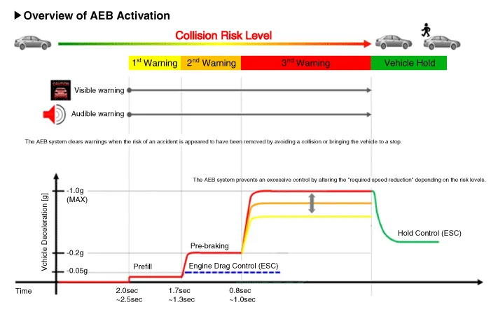 AEB system is designed to help avoid a potential collision or reduce its impact when drivers applies inadequate, delayed or no brakes at all to avoid a collision.