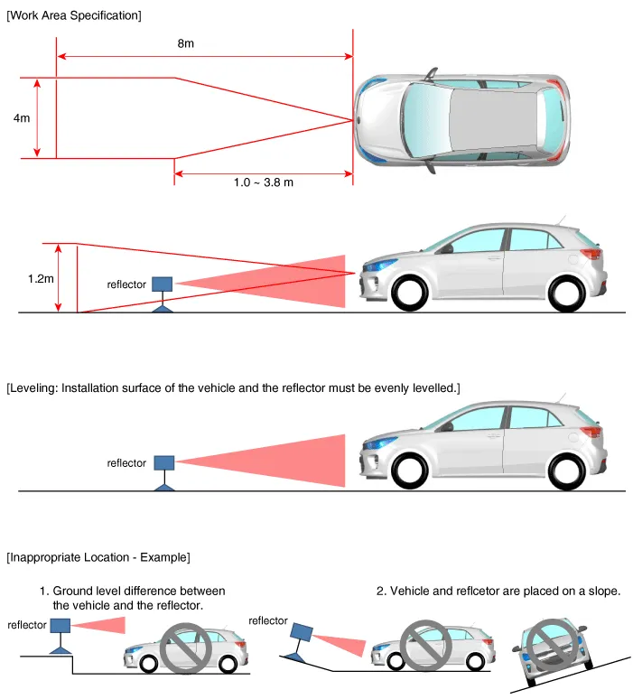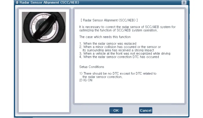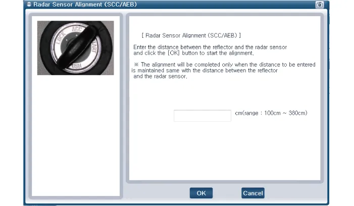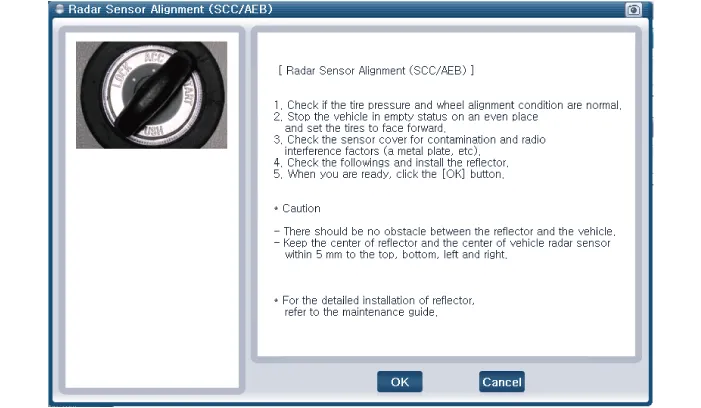 In order for the radar sensor to operate correctly, it must be properly aligned parallel to the driving direction of the vehicle.For this reason, the radar sensor alignment procedure must be carried out whenever the sensor has been reinstalled or replaced with a new one.