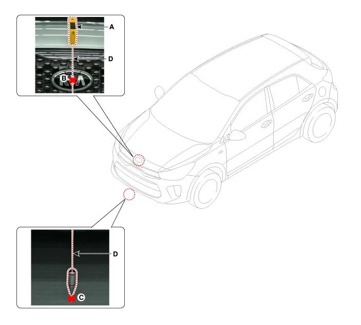 By using the SCC Calibration Reflector [SST No. : 09964-C1100] (A), adjust the wire (D) so that the center point of emblem (B) and the center point on the ground (C) are perpendicular to each other.