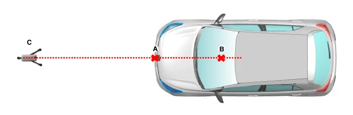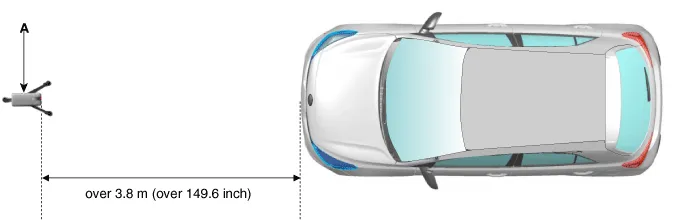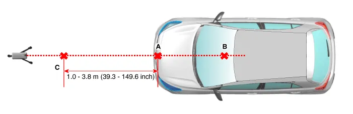 Mark (C) at 1.0 - 3.8 m (39.3 - 149.6 inch) from (A) in front of the vehicle.