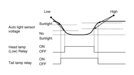 Check if the auto light control operates like a timing chart shown below. Tail lamp output and head lamp (Low) output is controlled based on the auto light sensor's input (illumination intensity) when the Auto Light Switch in Multi-Function Switch is turned ON, and the vehicle is in IGN1 or IGN2 ON Mode. If IGN1 = ON, BCM detects this voltage, and if the voltage exceeds rated voltage, then auto light failure occurs. (below 4V or above 6V)