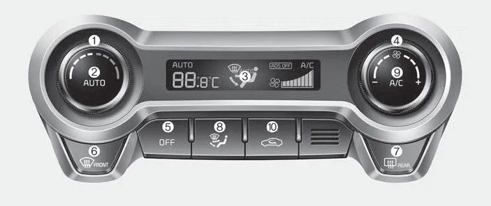 1. Push the AUTO button.The modes, fan speeds, air intake and air-conditioning will be controlled automatically by temperature setting. 2. Turn the temperature control knob to set the desired temperature.