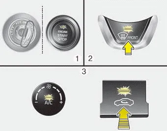 1. Turn the ignition switch to the ON position. 2. Turn the mode selection knob to the defrost position ( ). 3. Select any fan speed except “0” position.