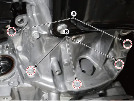 Loosen the transaxle lower mounting bolts (A, B).