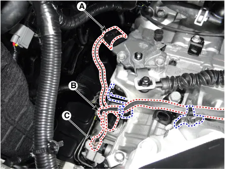 Disconnect the connectors (A, B, C) and then remove the wiring from the brackets.
