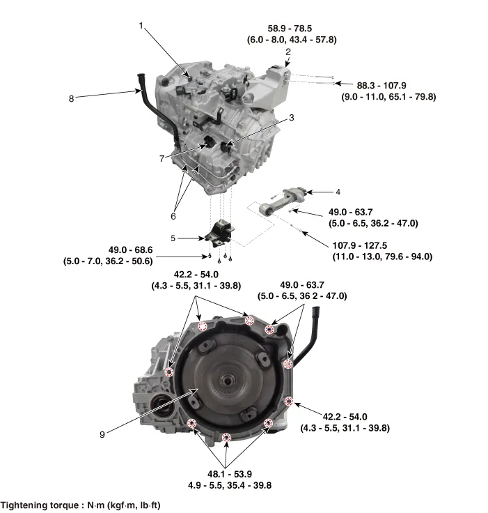 6. ATF cooler pipe 7. Main connector 8. ATF filler pipe 9. Torque converter |