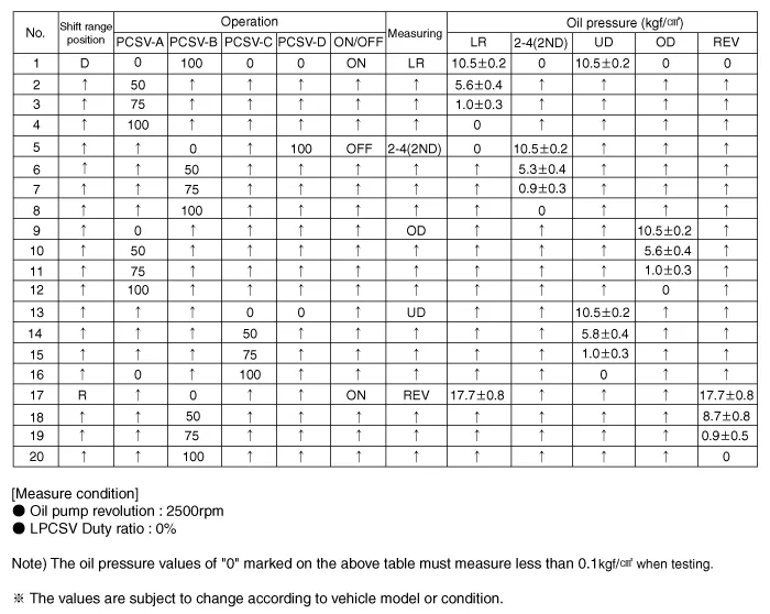 * Satisfy above condition at both ascending part of PCSV-D Sol (0 → 100%) and descending part (100 → 0%). * Duty rate of PCSV-D Sol having 0.2 kgf/cm² of DA pressure must pass through the range of 20 - 30%. * Minimum value should be below 0.2 kgf/cm². |