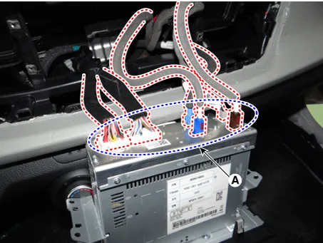 Remove the AVN head unit after disconnecting the connectors and antenna cable (A).