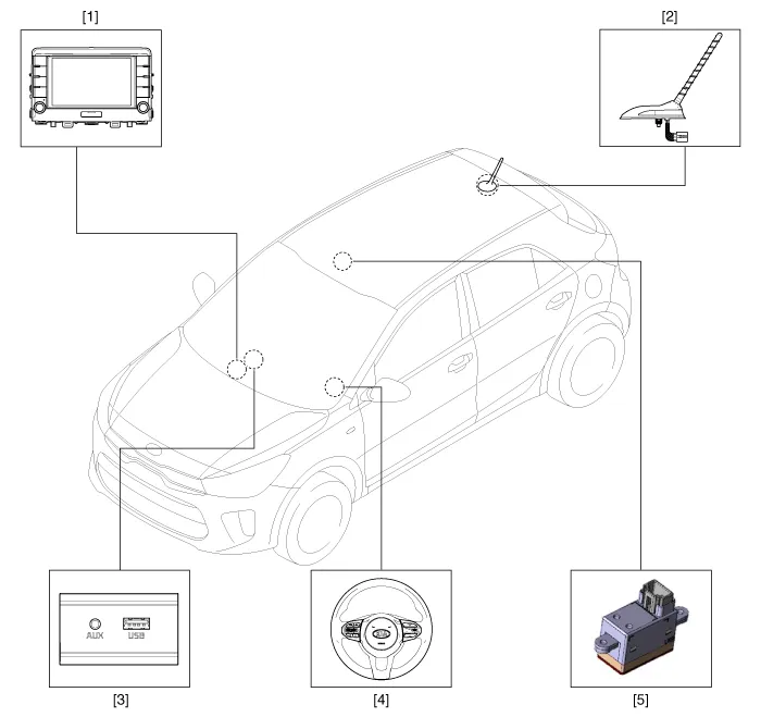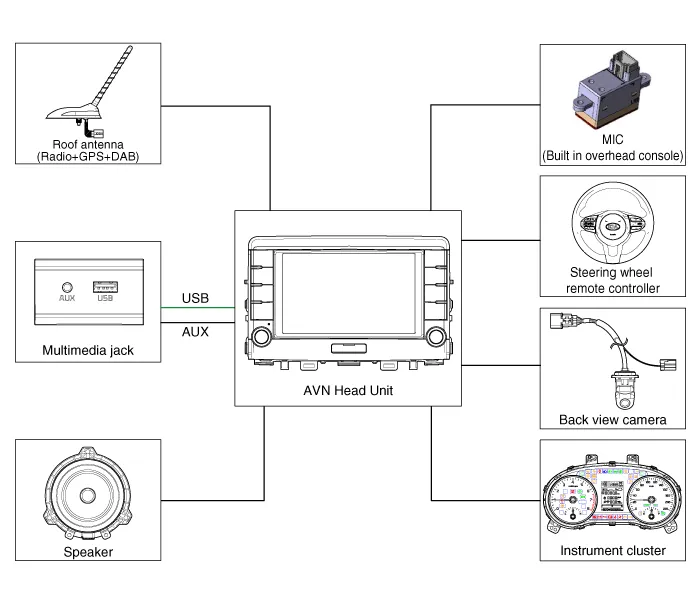 | 1 . AVN head unit 2. Roof antenna (Radio+GPS+DAB) 3 . Multimedia jack |