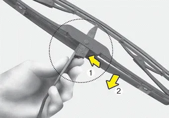 2. Lift up the wiper blade clip. Then pull down the blade assembly and remove it.