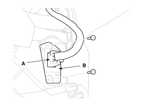Disconnect the connector (A) and then remove the blower resistor (B) after loosening the mounting screws.
