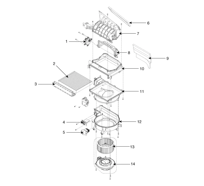 8. Intake door 9. NVH pad 10. Intake lower cover 11. Blower upper cover 12. Blower lower cover 13. Blower fan 14. Blower motor |