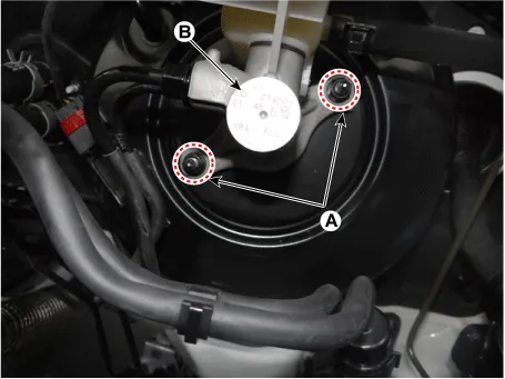 Remove the master cylinder (B) from the brake booster after loosening the mounting nuts (A).