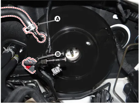 Remove the brake booster after disconnect the vacuum hose (A) and ISG connector (B).