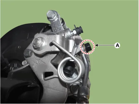 Disconnect the brake hose from the brake caliper by loosening the bolt (A).