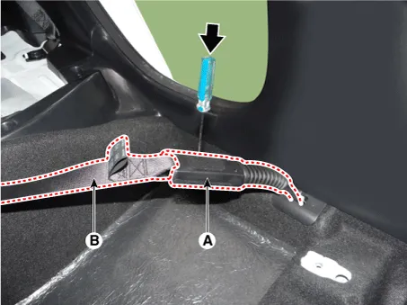 Remove the seat belt (B) from the EFD system by using the SST (0K888-D4200).