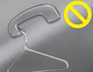 Do not hang other objects such as hangers or hard objects except clothes. Also, do not put heavy, sharp or breakable objects in the clothe pockets. In an accident or when the curtain air bag is inflated, it may cause vehicle damage or personal injury.