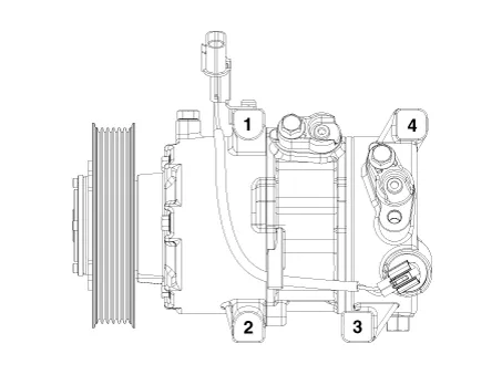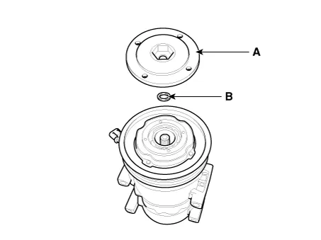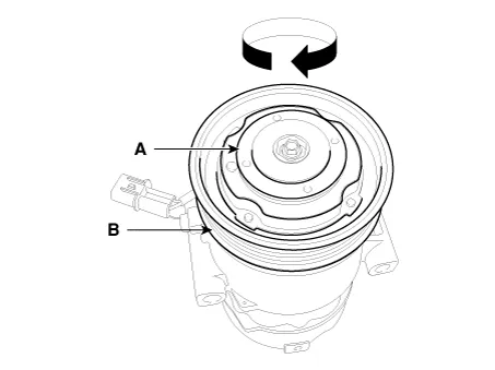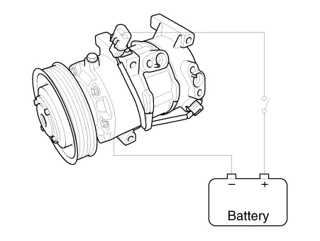 Check operation of the magnetic clutch. Connect the compressor side terminals to the battery (+) terminal and the ground battery (-) terminal to the compressor body. Check the magnetic clutch operating noise to determine the condition.