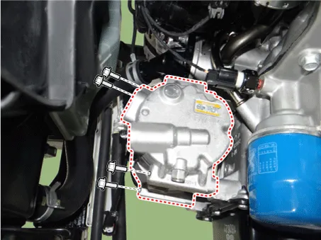 Make sure of the length of compressor mounting bolts, and then tighten it with the specified tightening order.