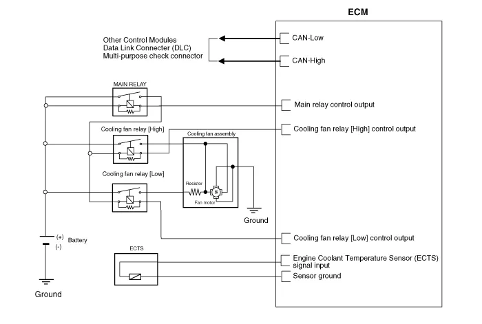The cooling fan operates in 2 stages (HIGH/LOW). The engine control module (ECM) controls the cooling fan according to the coolant temperature, vehicle speed and A/C operation.