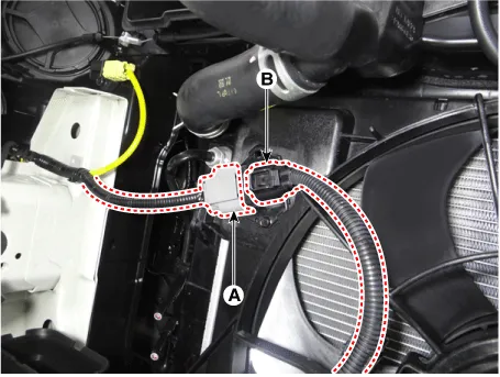 Disconnect the wire harness connector (A) and fan motor connector (B).