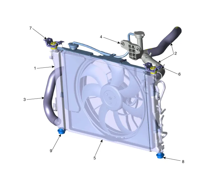 | 1. Radiator 2. Radiator upper hose 3. Radiator lower hose 4. Filler neck assembly 5. Cooling fan assembly |