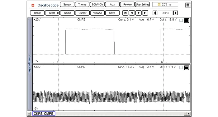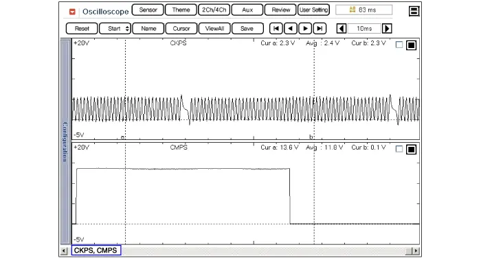 This example shows a typical Crankshaft Position Sensor(CkPS) and Camshaft Position Sensor(CMPS) waveform at idle.The PCM controls the injection and ignition timing by using these signals.