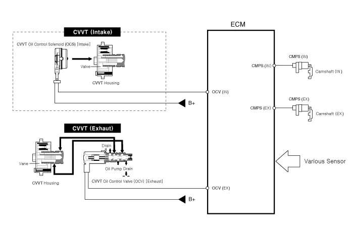 the CVVT Oil Control Valve (OCV) which supplies the engine oil to the cam phaser or runs out the engine oil from the cam phaser in accordance with the ECM PWM (Pulse With Modulation) control signal, |
