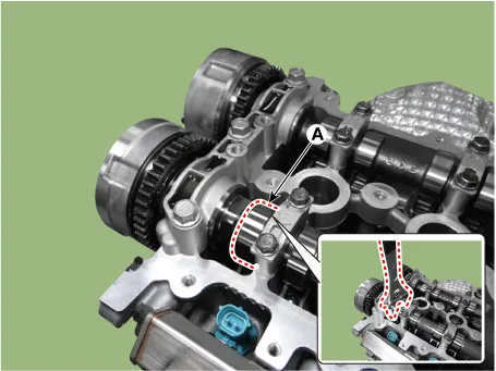 Remove the front camshaft bearing cap (A) and camshaft bearing cap (B).