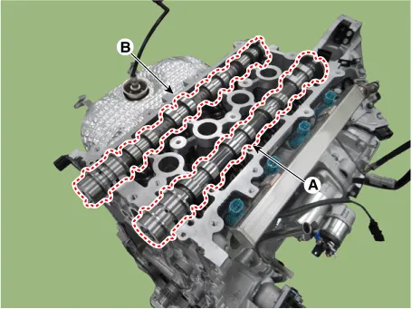 Install the intake camshaft (A) and exhaust camshaft (B).
