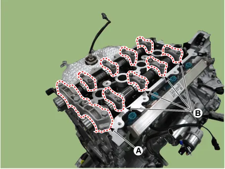 Install the front camshaft bearing cap (A) and the camshaft bearing cap (B) as following method with specified torque.