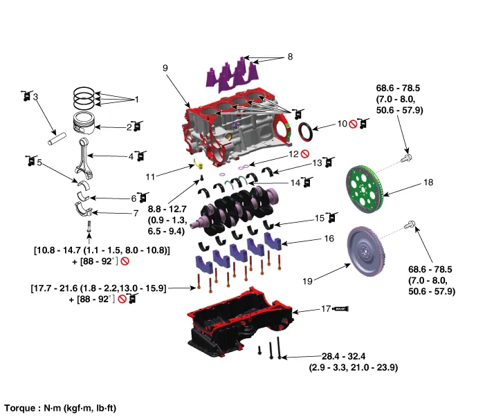 11. Piston cooling jet 12. O-ring 13. Crankshaft upper bearing 14. Thrust bearing 15. Crankshaft lower bearing 16. Main bearing cap 17. Ladder frame 18. Drive plate 19. Flywheel |