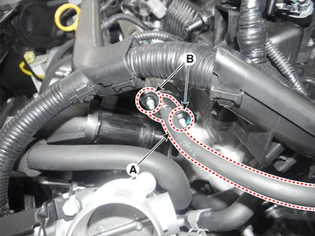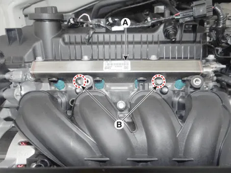 Remove the installation bolts (B), and then remove the delivery pipe & injector assembly (A) from the engine.