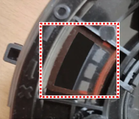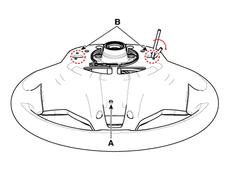 While turning the steering wheel to left and right, press the parts marked A (3 red dotted circles) under the steering wheel and then remove the airbag module.