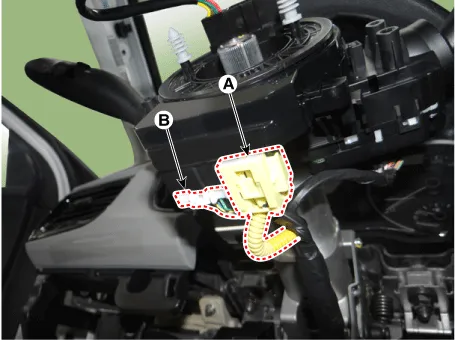 Separate clock spring wiring harness connector (A) to the horn wiring harness connector (B) in a clock spring.