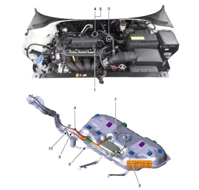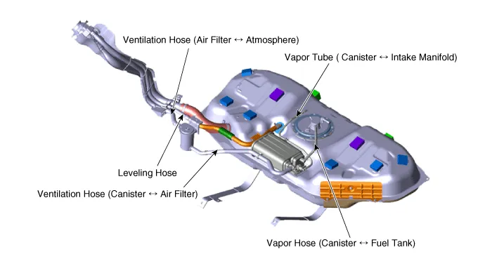 6. Leveling Hose 7. Vapor Tube ( Canister ↔ Intake Manifold) 8. Vapor Hose (Canister ↔ Fuel Tank) 9. Ventilation Hose (Canister ↔ Air Filter) 10. Ventilation Hose (Air Filter ↔ Atmosphere) |